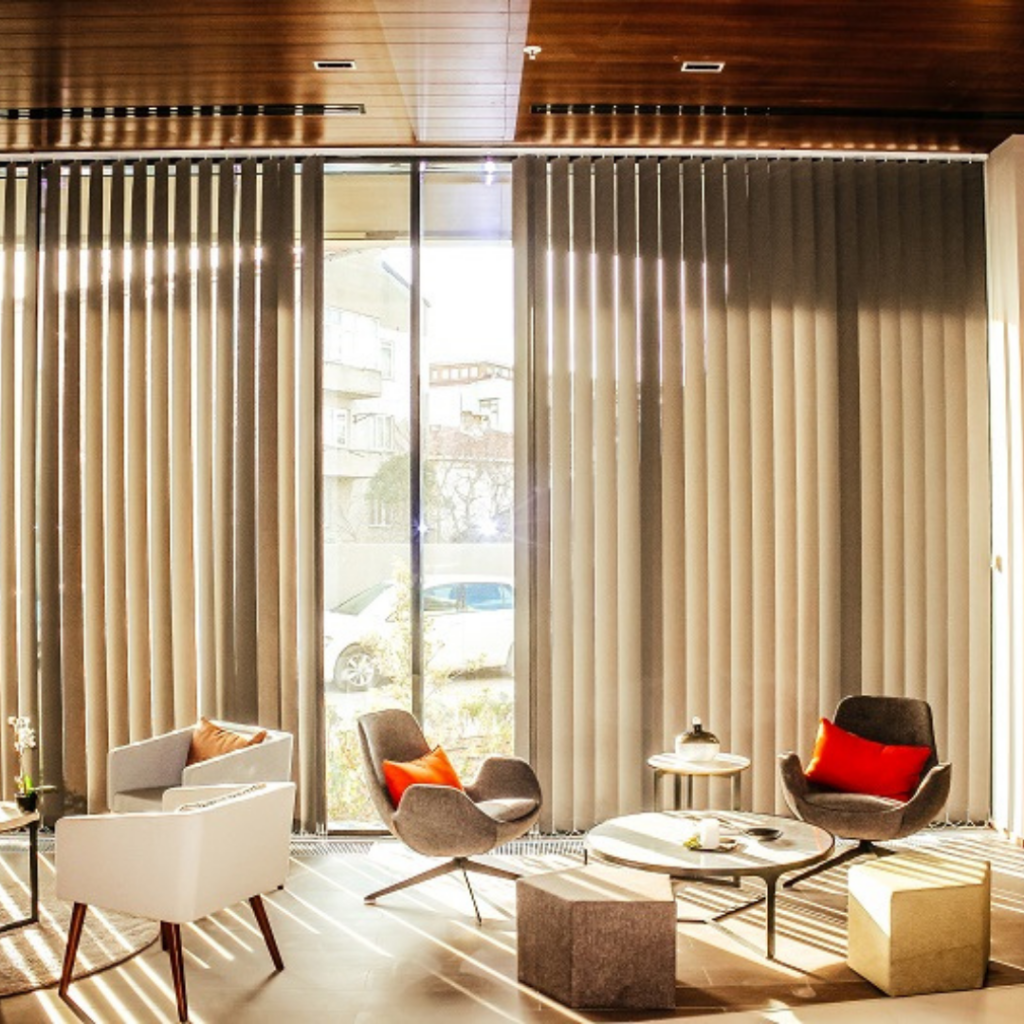Dikey Perdeler, büyük camlarda, geniş alanlarda kullanım için son derece uygundur. Hem büyük ofislerde hem de geniş salonlarda rahatlıkla kullanılabilir. Dikey perdeler, büyük pencerelerde veya cam duvarlarda, ışık kontrolünü kolayca sağlayarak rahat bir atmosfer yaratır.